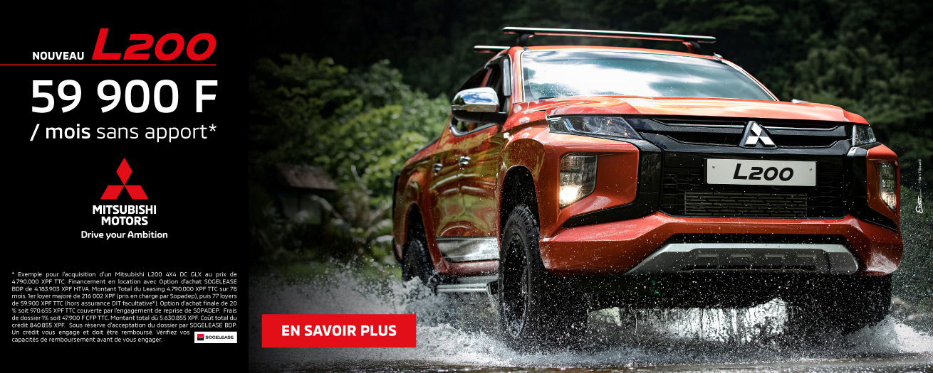 * Exemple pour l’acquisition d’un Mitsubishi L200 4X4 DC GLX au prix de 4.790.000 XPF TTC. Financement en location avec Option d'achat SOGELEASE BDP de 4.183.903 XPF HTVA. Montant Total du Leasing 4.790.000 XPF TTC sur 78 mois. 1er loyer majoré de 216 002 XPF (pris en charge par Sopadep), puis 77 loyers de 59.900 XPF TTC (hors assuranceDIT facultative*). Option d’achat finale de 20 % soit 970.655 XPF TTC couverte par l'engagement de reprise de SOPADEP. Frais de dossier 1% soit 47.900 F CFP TTC.Montant total dû 5.630.855 XPF. Coût total du crédit 840.855 XPF. Sous réserve d'acceptation du dossier par SOGELEASE BDP.Un crédit vous engage et doit être remboursé. Vérifiez vos capacités de remboursement avant de vous engager.